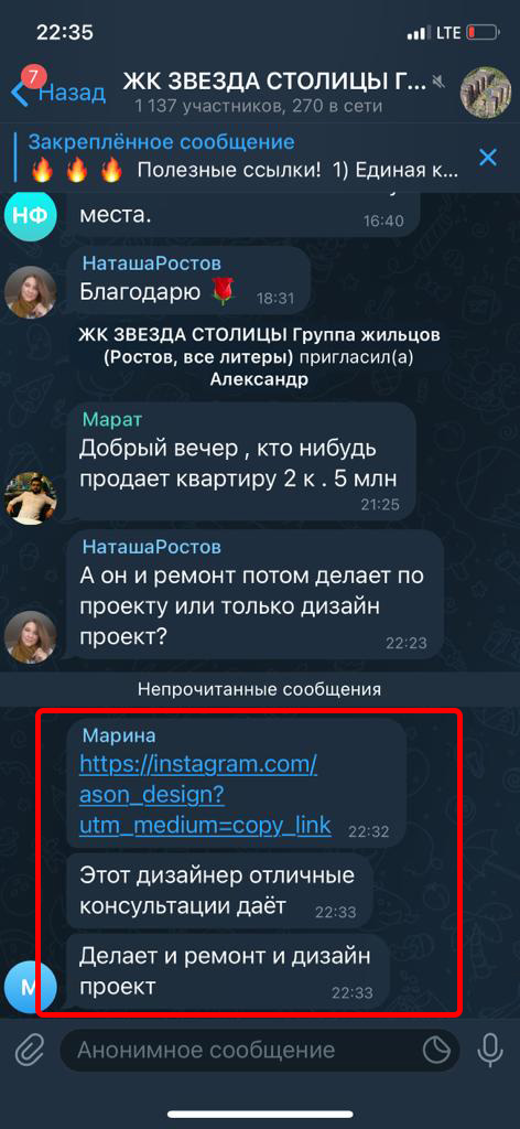 Реклама размещается в группах (чатах) жильцов в Телеграмм. Реклама закрепляется вверху каждой группы на месяц. Каждый пользователь заходя в группу постоянно видит закрепленное сообщение.